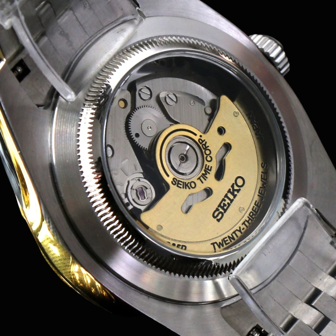 The Seiko Mod Daytona Phantom Panda Edition redefines stealth luxury with a bold monochrome aesthetic. Its matte black dial, contrasted by crisp white chronograph subdials and luminous accents, creates a powerful visual statement of precision and refinement. The black ceramic bezel and matching rubber strap enhance its modern, tactical appeal, making it a perfect blend of sportiness and sophistication.